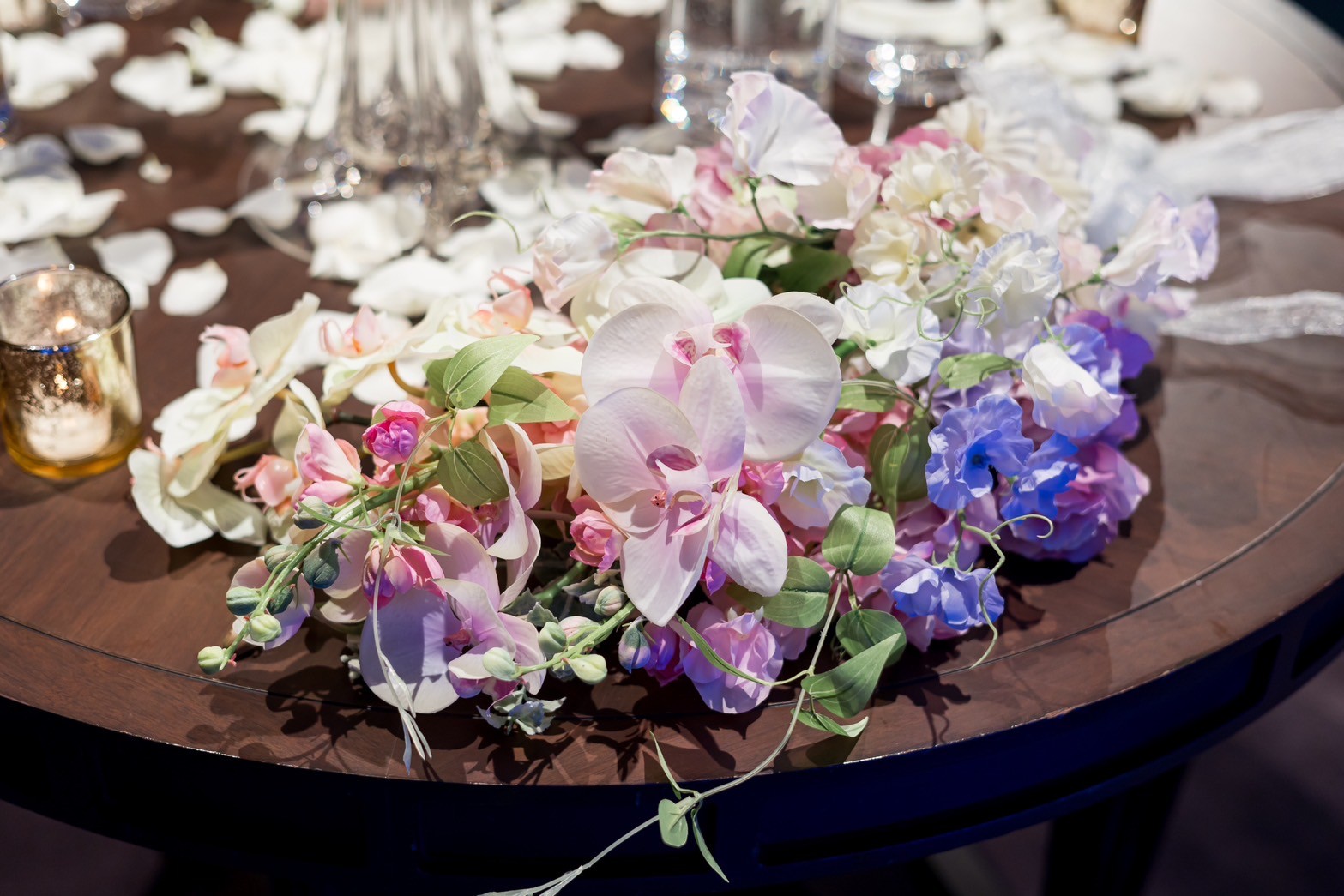 最終的には、ドレスの色を少しずつ展開するような同系色のグラデーションでまとめたことで、ドレスとの一体感が生まれました。